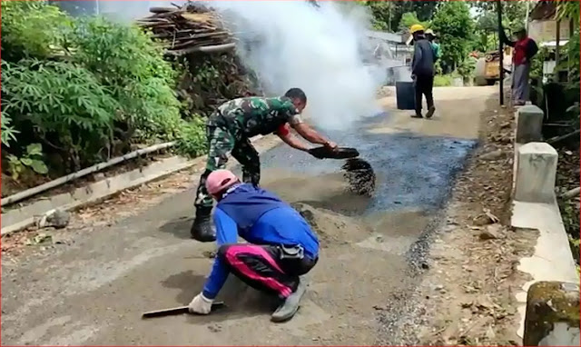 Saling bahu membahu penuh kebersamaan dan kemanunggalan antara Babinsa, perangkat desa dan warga Dukuh Krajan, Desa Sambilawang mengerjakan pengaspalan sesuai tugas masing – masing dengan penuh tanggung jawab.(MdC0802)